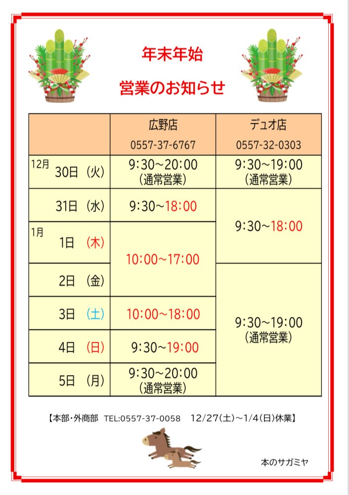 年末年始営業のお知らせ